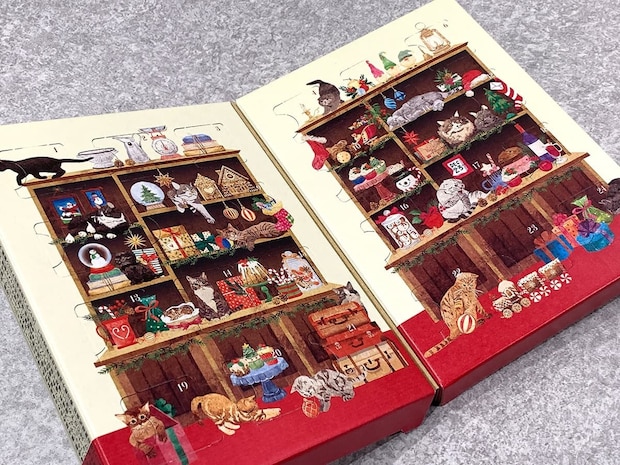 本の形状をした紙製のアドベントカレンダー。本物の本のように開く仕組みで、見開きが12月1日から12月24日までカウントダウンできるアドベントカレンダーとなっています。
