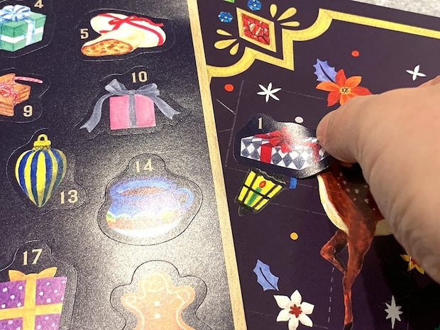 自分でカレンダーを完成させる楽しさがあるのも、本品の大きな魅力!付属のシールにはイラストと1~24の数字が描かれており、日付のない本品に貼り付けてカレンダーを完成させていきます!