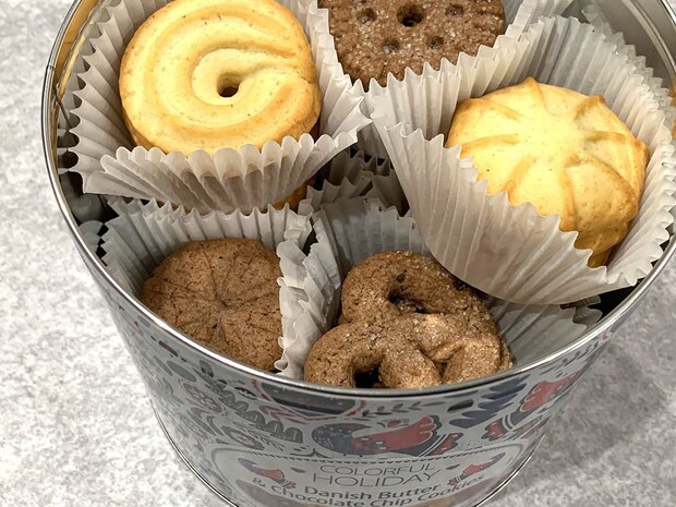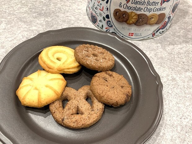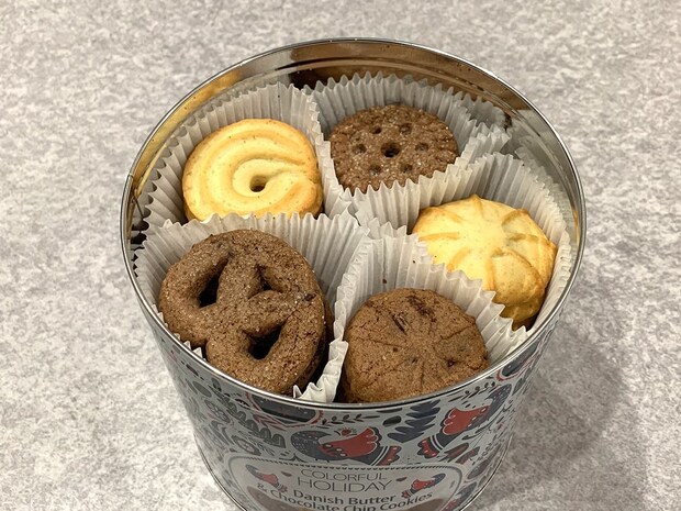 蓋を開けてみると、缶の中にはバタークッキーとチョコチップクッキーが入っていました。それぞれ紙カップに入っていて、形が崩れず整然と並ぶ様子も美しいです!