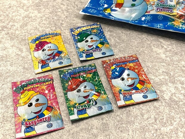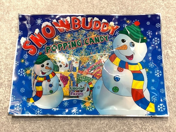 青いパッケージに大きな雪だるまが描かれた冬らしさ満点の「スノーバディ ポッピングキャンディバッグ」をご紹介します。