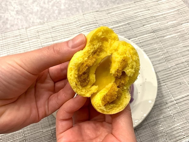 カボチャらしい風味をしっかり感じられる中華まんで、甘さは控えめに作られています。紫芋まんより、中のあんも甘さは抑えられている印象。