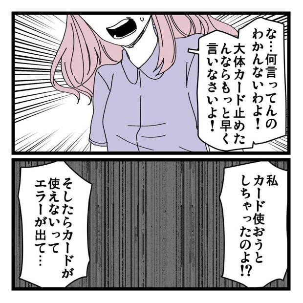 すぐにキャッシュカードを止めます。すると、興奮しながら家にやってきた義姉。「警察が来たら」という発言は、義姉に「やましいことがある」と言っているようなもの…。いよいよ、義姉に真相を問いただします。