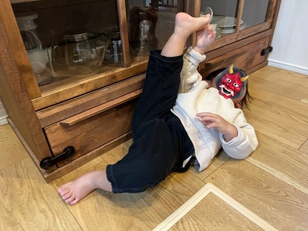 一見すると運動や遊んでいるように見えますが…こうやって息子さんはイヤイヤを表現しているのだそうです。大きく足を振りかぶって、まるでアルファベットのY字のよう。イヤイヤ期というと子どもたちは大の字で表現するイメージがありますが、こういった形もあるのですね。