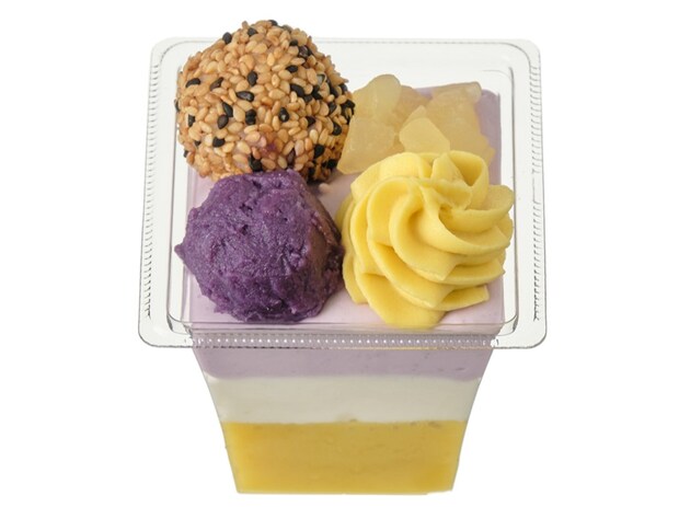 ほくほく食感ですっきりとした甘さの紫芋と、ねっとり食感で強い甘みの紅はるかを使用した。胡麻団子やシロップ漬けのりんごダイスなどを組み合わせ、食感や味わいの変化が楽しめる。