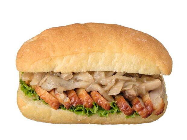 しっとりもちもちとした食感のイタリア発祥「チャバタ」で、グリルチキンと秋の食材きのこをたっぷりと挟んだ。旨味があり食感のよい舞茸と香ばしいエリンギを使用し、醤油だしで仕上げているため、和の味わいが楽しめる。