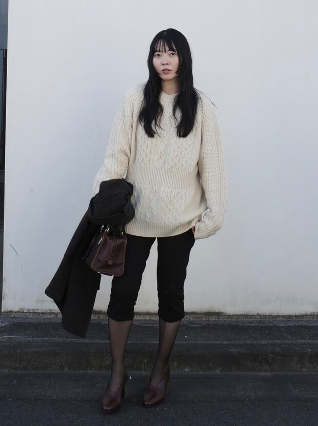 「ゆったり長め丈のケーブルニットが主役になるよう、タイトなボトムをスッキリと合わせました。ほっこりし過ぎないように、ジャケットや小物はダークブラウンで統一したのもポイントです」