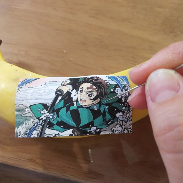 バナナアートのコツは、リズムよくトントンと刺していくことです。実の部分に到達するほど深く刺してしまうと、傷みやすくなってしまいます。紙を貼ってある状態と、はがした状態で微妙に刺す力を変えて、ほどよい浅さでリズミカルに進めてください(コレがなかなか難しい…)。
