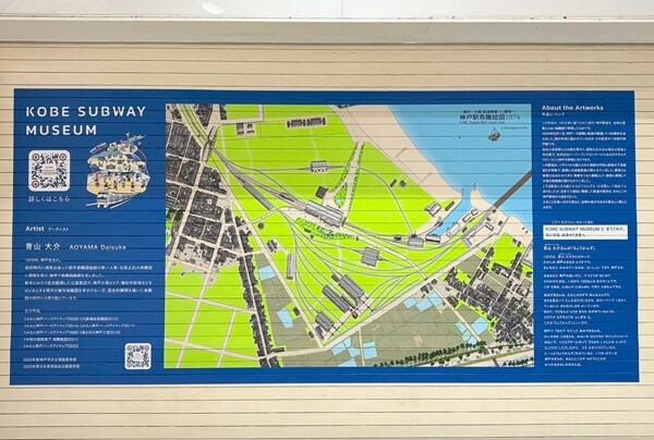 青山大介氏が2024年に制作した作品で、現在のハーバーランド駅付近にかつての「初代神戸駅」が位置していた歴史をもとに、当時の景色を横幅3メートルに及ぶ鳥瞰図で再現。街の記憶と現在の人々の往来を重ね合わせ、見応えある展示となっている。
