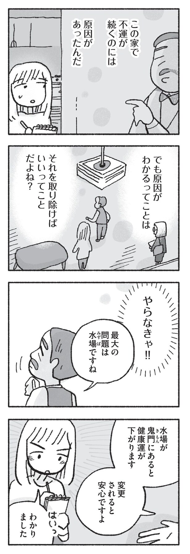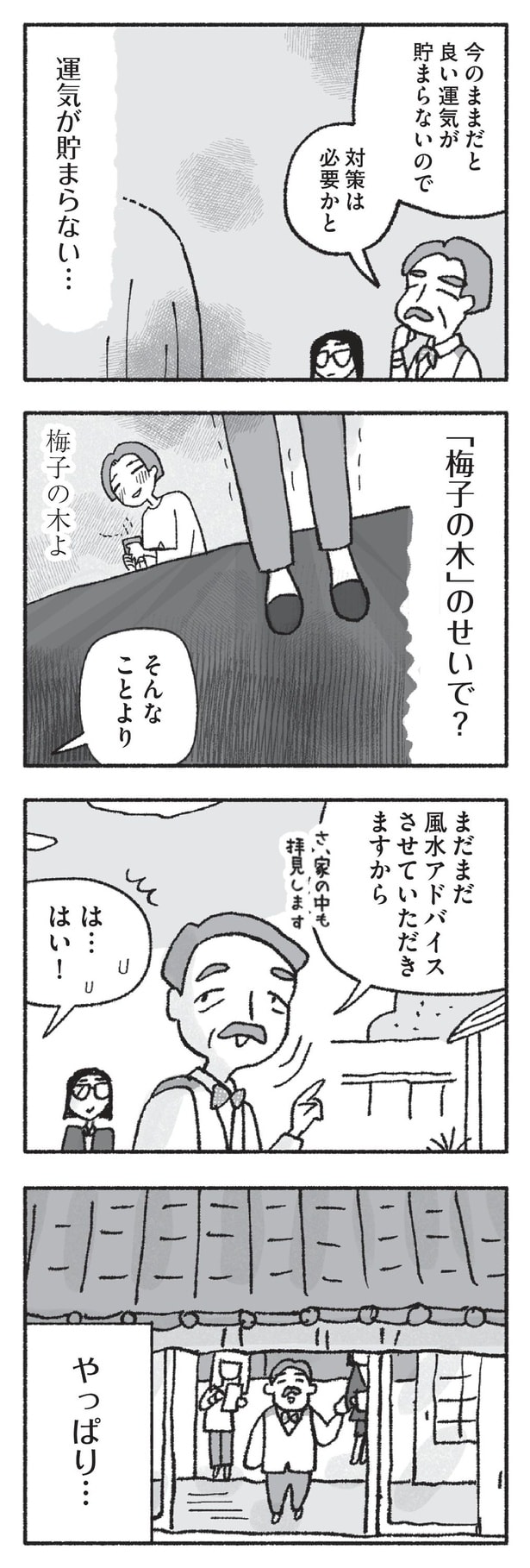 2人の子供と優しい夫に囲まれて幸せに暮らしている専業主婦・梅子。その一方で自分に自信が持てない梅子は、大人になってから「ツイてない」と思うことが増えていた。そんな中、亡き両親が遺した実家のリフォームを計画するが、実家で娘が怪我をするなど不運な出来事が続いたことに不安を覚えた梅子は、親友からの勧めで半信半疑ながらも風水師を頼ることに。風水を意識し始めてから小さな幸運が続き、効果を実感した梅子はどんどん風水に執心していくようになり――?