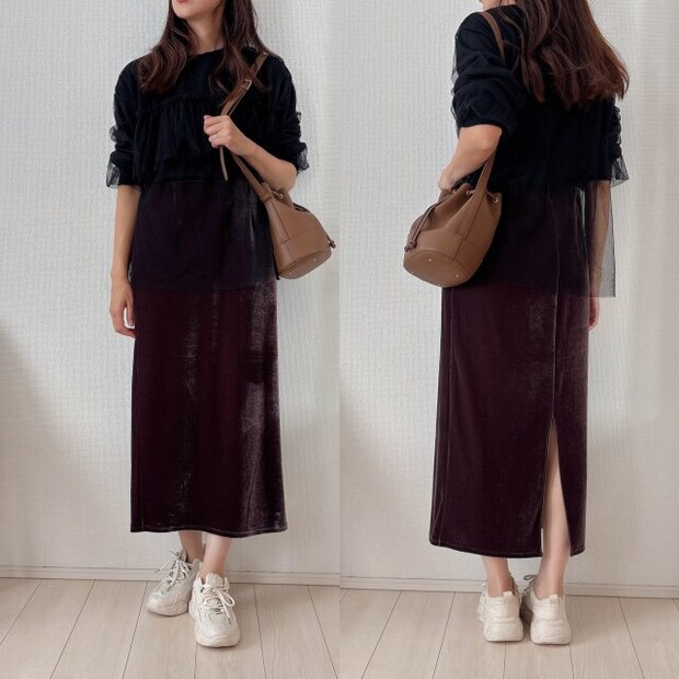 まずはブラックのチュール付きトップスとスニーカーを合わせてカジュアルコーデにしてみました。ブラックを合わせると落ち着いた雰囲気になって秋冬らしいコーデになりました。足元はホワイトのスニーカーで抜け感をプラスしました。