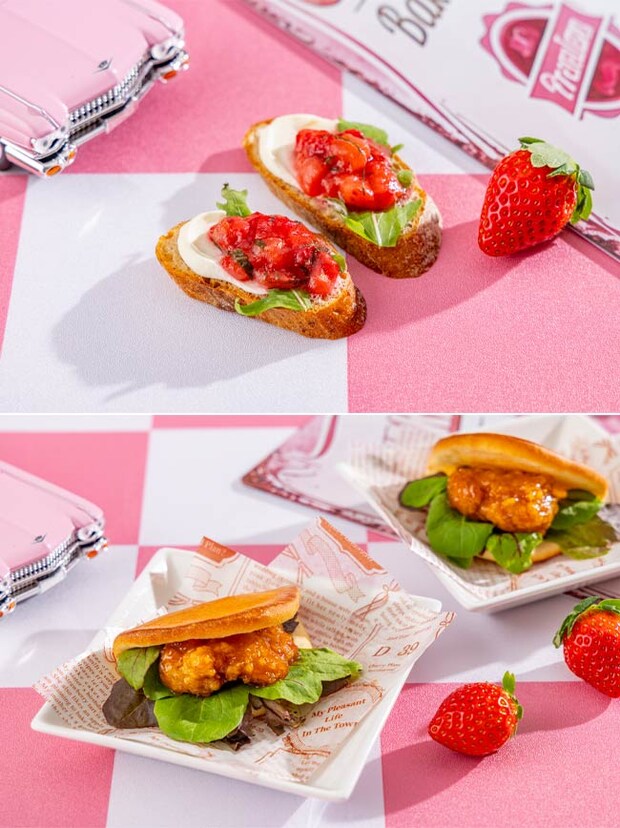 ほかにも、パーカーハウスロールを用い、オレンジソースを和えたフライドチキンをサンドした「オレンジチキンパーカーハウスサンド」、カンパーニュバゲットにフレッシュいちごをバルサミコ酢とバジルで和え、ブルスケッタのように仕上げた「ストロベリーブギウギ」など、多彩なお食事パンが揃うのでお楽しみに。