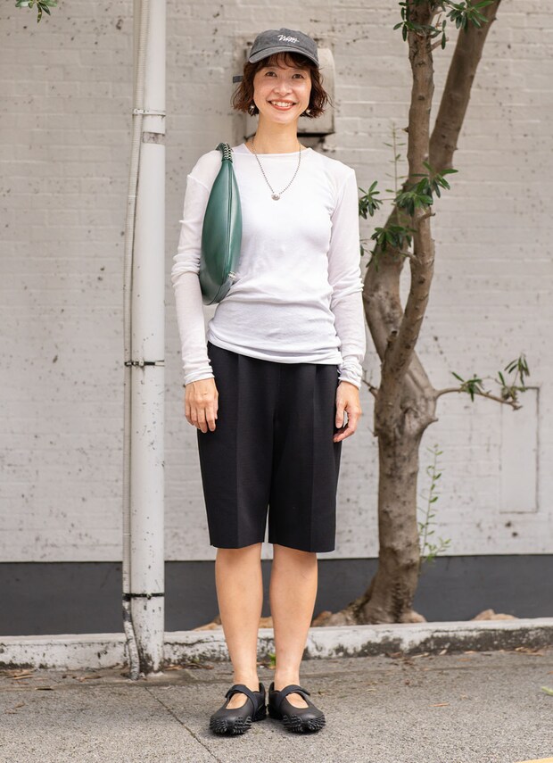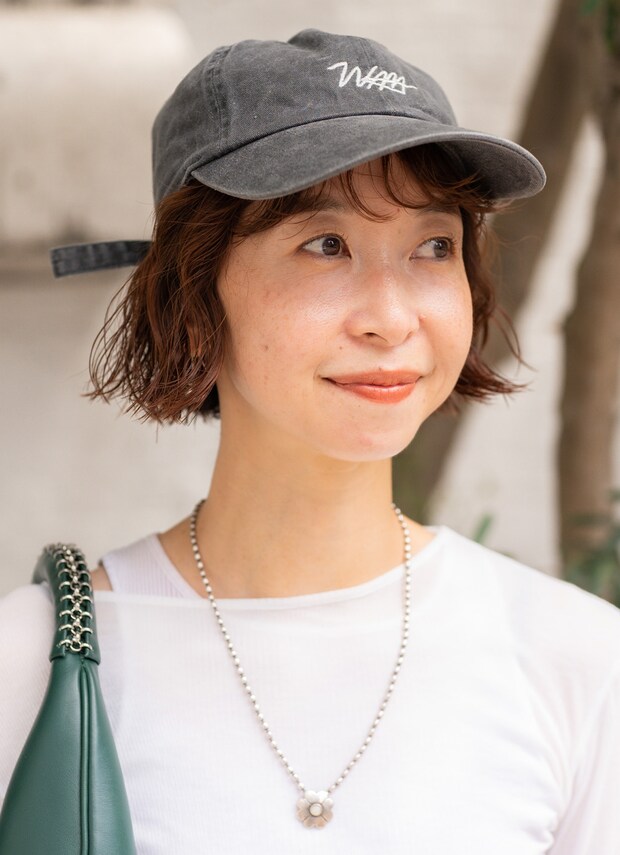 クリーンなトップスにシルバーのネックレスが好アクセント! ヴィンテージ感のあるキャップを被って、奥行きのあるスタイリングの出来上がり。