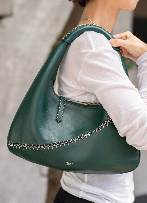 『コーラ』のバッグは、スタッズがさりげなく光る逸品。深いグリーンのレザーで秋ムードを満喫♪