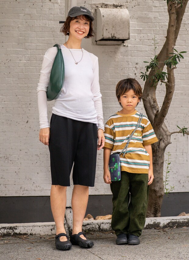 今季はグリーンとブラウンが気になっているというママ。ミニマムなスタイルをキャップとスニーカーで外して、スポーツMIXに昇華! キッズはボーダートップスにお気に入りのバッグを下げてプレイフルに表現。秋の行楽にぴったりなリンクスタイルはぜひ参考にしてみて。