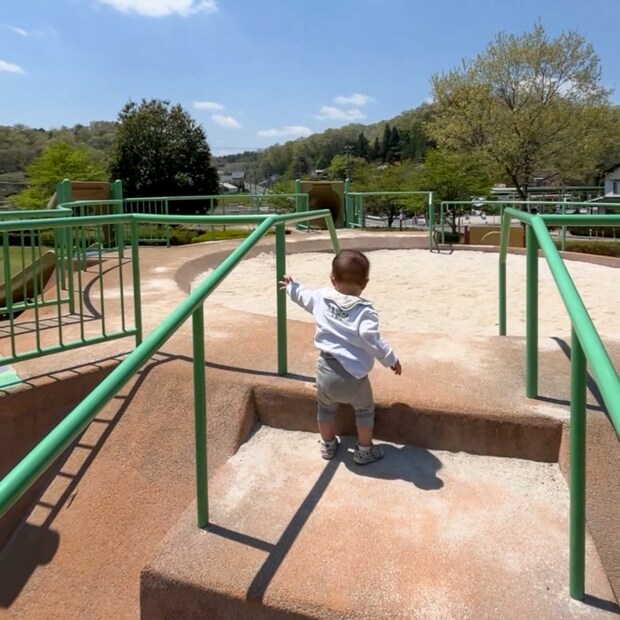 1歳の三男は、円形のすべり台付きの砂場を楽しんでいました。