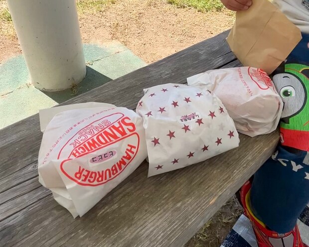 近くのバーガーハウスピコピコさんでテイクアウトしたハンバーガーをほおばって最高の休日でした。