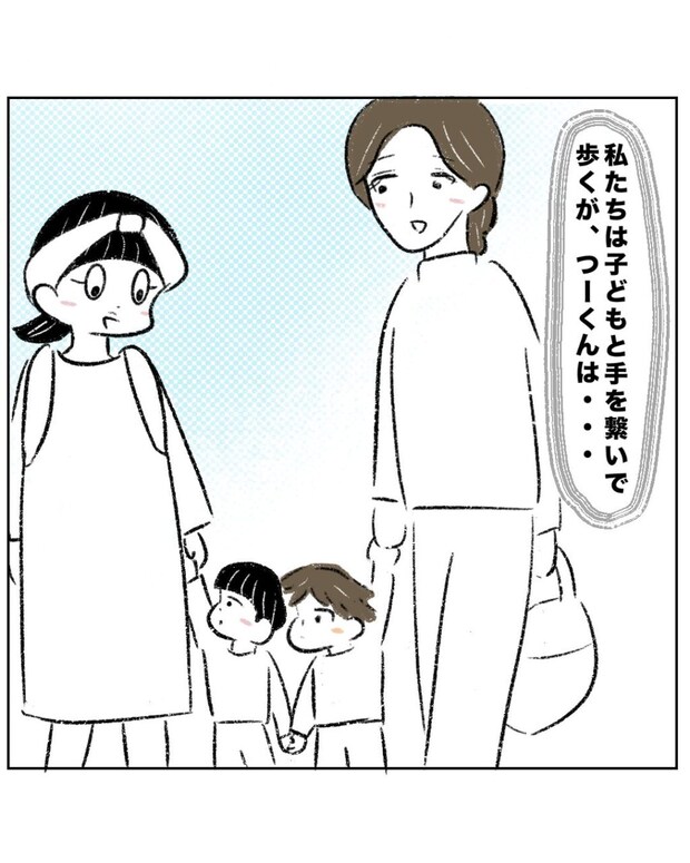まるさん、まーくんママ、つーくんママ親子はみんなでスーパーに向かって歩き始めました。まるさんとまーくんママはしっかり子どもと手を繋いで歩いていたのですが、