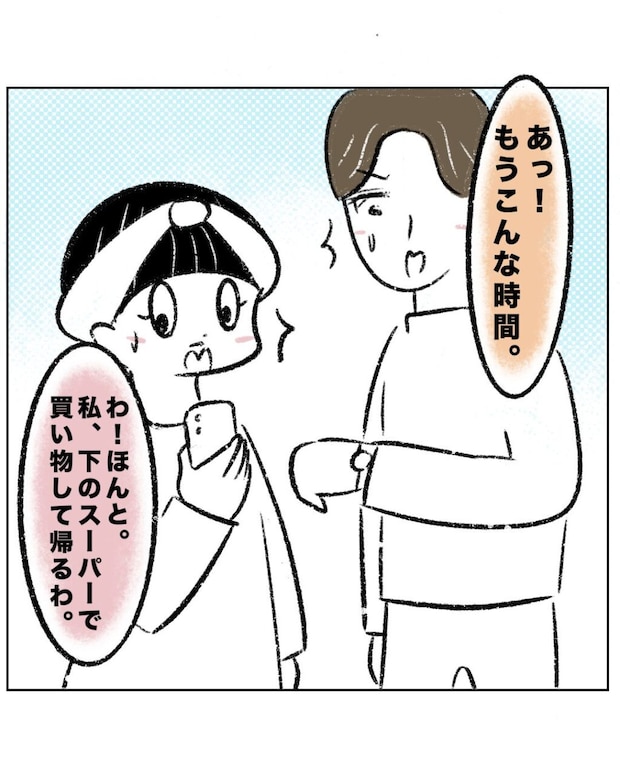 そのとき、時計を見たまーくんママが「あっ!もうこんな時間」と焦りだし、まるさんも「わ!ほんと。私、下のスーパーで買い物して帰るわ」と言って帰り支度を始めました。