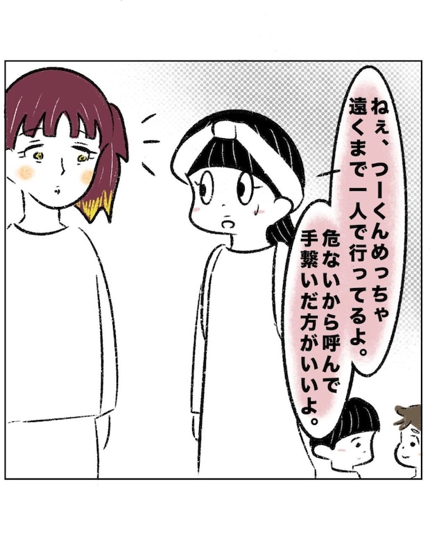 どんどん離れていくつーくんを見て心配になったまるさんは「ねぇ、つーくんめっちゃ遠くまで一人で行ってるよ。危ないから呼んで手繋いだ方がいいよ」とつーくんママに言いました。