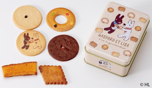 クッキー缶の蓋には、泉屋の代表的なクッキー「リングターツ」を持ったリサとガスパールをデザインした。缶の中には、蓋と同じデザインのプリントクッキーが1枚、リサとガスパールをイメージしたバター風味の限定クッキーが各2枚、その他リングターツなど泉屋の人気クッキーが5枚、計10枚が個包装で入っている。