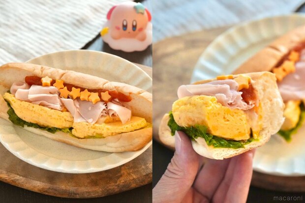 ふわふわプルプル食感なオムレツは、塩気や旨みが絶妙で主役級の存在感。ふかふかのパンに薄切りハムやトマトソースがマッチし、カービィのワープスター風のコクあるチーズのアクセントも相まって食べ応え抜群なサンドでした。商品情報