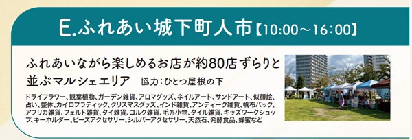 「ふれあい城下町人市」は、ふれあいながら楽しめるお店が、約80店ずらりと並ぶマルシェエリア。ドライフラワー、ガーデン雑貨、ネイルアート、クリスマスグッズ、アクセサリー、各国の雑貨、発酵食品、キッズワークショップなどを楽しむことができる。