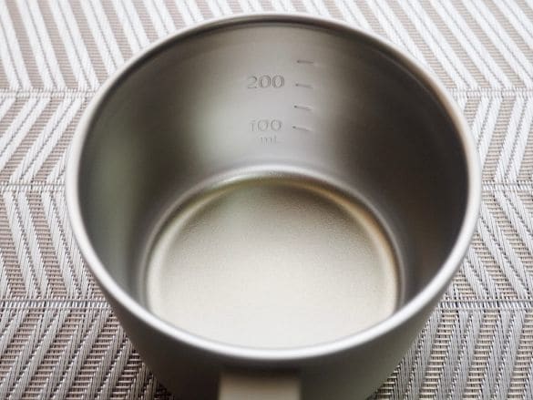 それと、陶器製のマグカップと比べて軽いから、手が疲れにくいところも高ポイント。マグカップの内側には100ml、150ml、200ml、250mlの目盛り付き。即席スープや粉末飲料を作る時、計量カップでお湯を量る必要がないからとっても楽&便利です。