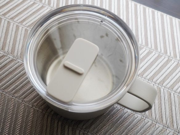 「目盛り付き 保温保冷 蓋付きマグカップ」のカラーヴァリエーションは、ここで紹介するグレーベージュのほかに黒とシルバーがラインナップ。サイズは250mlと400mlの2種類あります。