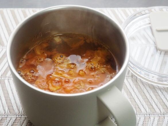 ここで目盛りが大活躍! いつもだったら計量カップを使うか目分量にしてしまうところ、直に適量の熱湯を注ぐことができます。