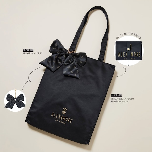 増刊号の付録は「アレクサンドル ドゥ パリ」とコラボした、Aマークのロゴがキャッチーなビッグリボンチャームと、レディ見えを叶えてくれるサテン調のトートバッグ。黒&しっかりマチつきで、どこへでも連れていける自慢のセット。リボンチャームは手持ちのバッグやスマホにつけて、自分流にアレンジを楽しむのも◎。