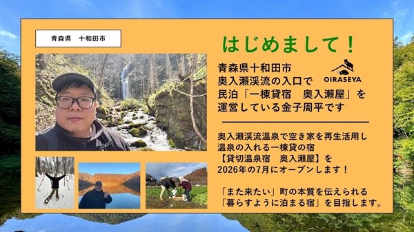 十和田市で「一棟貸宿 奥入瀬屋」を運営している奥入瀬屋の代表・金子周平氏は、2021年4月に地域活性化起業人として、観光による地域貢献のために、都内の旅行会社から青森県十和田市に移住し、十和田市の観光協会で2年ほど働いていた。