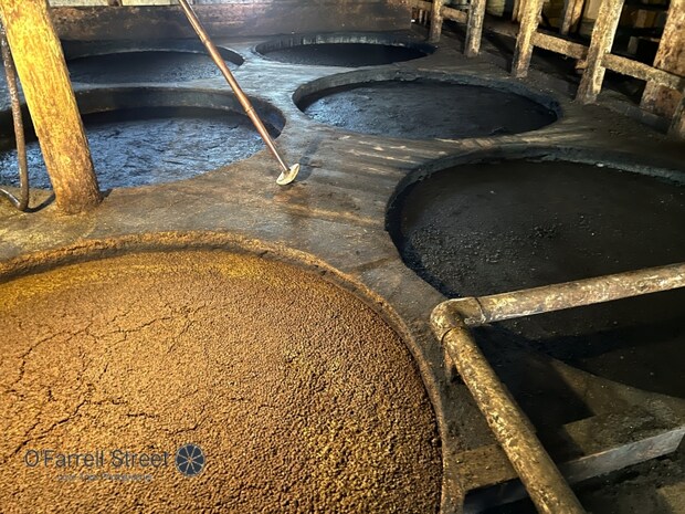 ヤマロク醤油のもろみ蔵は、木造平屋で床は土間、壁は土壁、中に入るとひんやりとした空気の中で醤油の香りに包まれます。蔵は100年以上前(明治初期)に建てられ、国の登録有形文化財に指定されている貴重な建物です。蔵いっぱいに並んだ樽の製造年数は100年前のものから10年前のものまでと様々ですが、ひときわ目を引くのが、今にも崩れそうなくらいボロボロに見える杉桶です。腐っているわけではなく、この中にも大切な菌たちが暮らしているのだそうです。樽にはもちろん、梁や土壁など、土間の中には100種類という酵母菌や乳酸菌たちが暮らしているのだそうです。