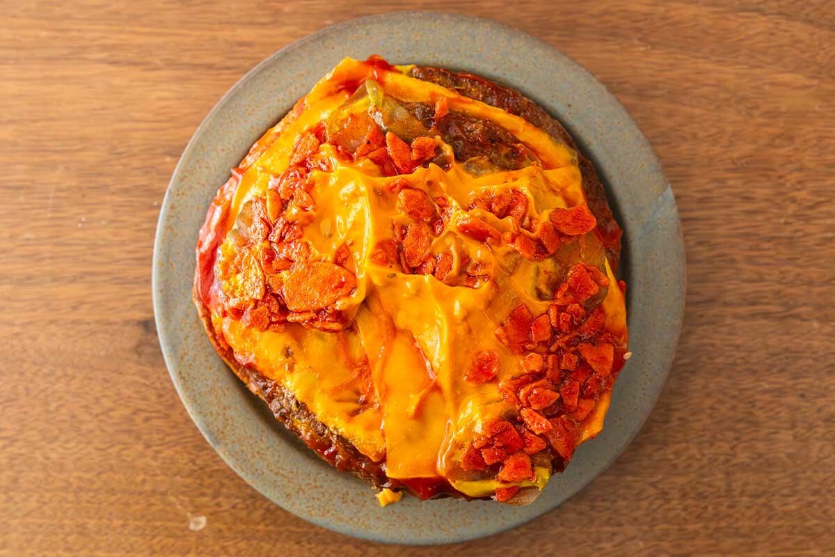 直火焼きの100%ビーフパティ2枚に、チェダーチーズを4枚、ピクルスを重ね、ケチャップとマスタード、さらにガーリックペースト、フライドガーリック、ガーリックパウダーの3タイプのにんにくに、チリペッパーとブラックペッパーを効かせた、ガツンとくるうまさの「特製ガーリックソース」と、クセになる辛さと旨味が特長の「スパイシーガーリックフレーク」で仕上げた本格チーズバーガーです。
