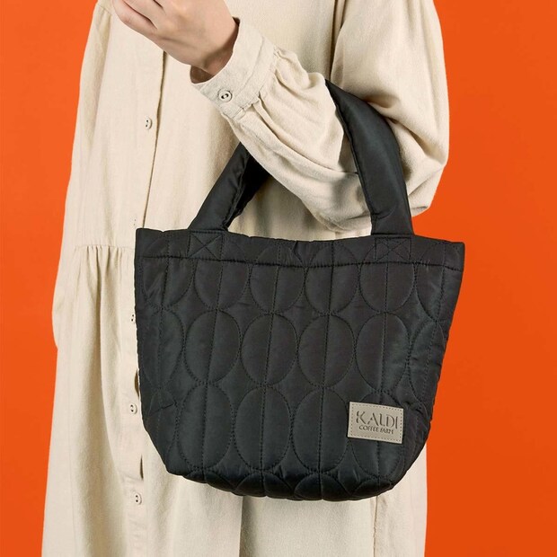 「コーヒー福袋豪華セット」のバッグは、コーヒー豆柄のキルティングを使用。黒色を基調に「KALDI」ロゴを配した、シンプルなデザイン。内ポケット付き。バッグの大きさは、約縦23×横30×マチ12cm、持ち手35cm。