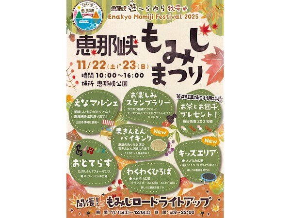 恵那市観光協会は、 11月22日(土)~11月23日(日)の2日間、岐阜県恵那市恵那峡公園にて毎年恒例の、「恵那峡もみじまつり」を開催。時間は10:00~16:00。「えなマルシェ」「音楽ステージおとてらす」「お楽しみスタンプラリー」など、2日間にわたりイベント盛りだくさん。大人から子どもまで楽しめるイベントとなっています。