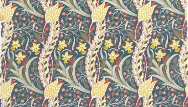 「らっぱ水仙(Daffodil)」は、水仙の花群と生き生きとした葉のうねりを、規則正しい反復に落とし込んだ、ジョン・ヘンリー・ダールによる1891年頃のデザイン。アーツ&クラフツを象徴する“自然の秩序美”を映したこの柄は、「ウィリアム・モリス」で大切に受け継がれ、今もさまざまなアイテムに生かされている。