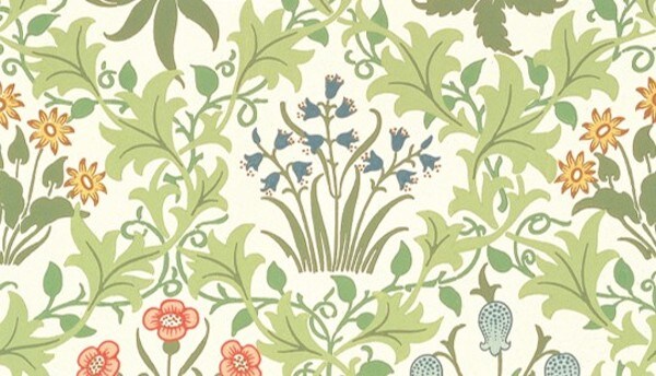 「セランダイン(Celandine)」は、蔓が織りなすネット状の構図の中に、野に咲く可憐な花を一つずつ収めた、モリスの一番弟子ジョン・ヘンリー・ダールによる19世紀末の意匠。モリス初期作「Daisy」を想起させる素朴な花々(セランダイン、ブルーベル、カンパニュラなど)が、やさしい色調で気品を添える。