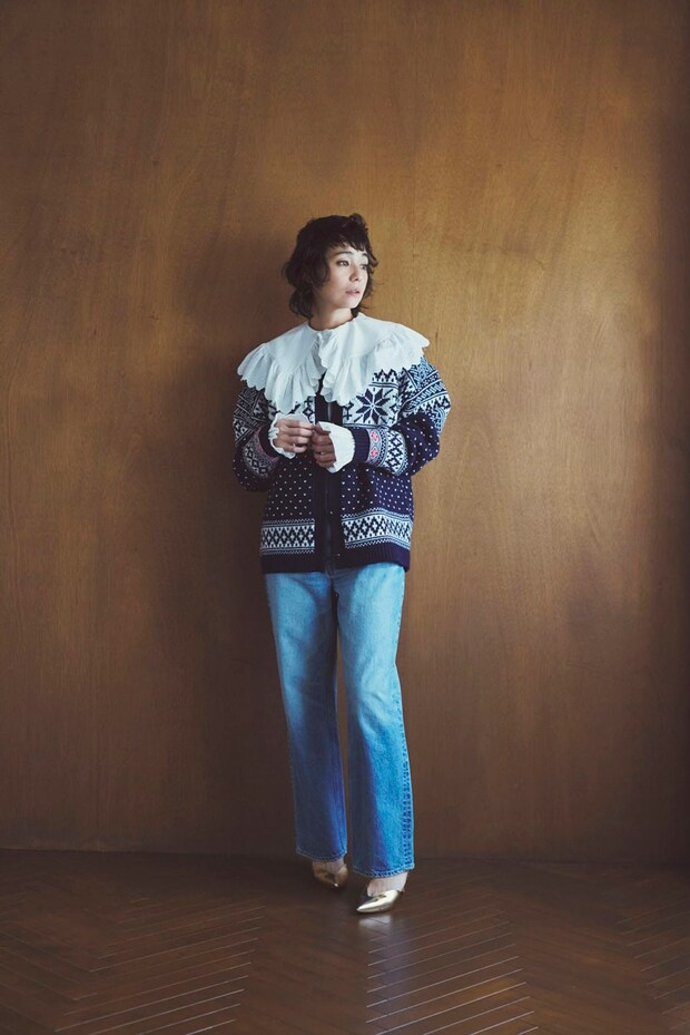 デニムパンツ〈ハドソン〉¥34,100、ブラウス¥31,900、カーディガン¥29,500(全てザ シンゾーン/シンゾーン 表参道本店)、シューズ¥68,200(ネブローニ)、ソックスはスタイリスト私物