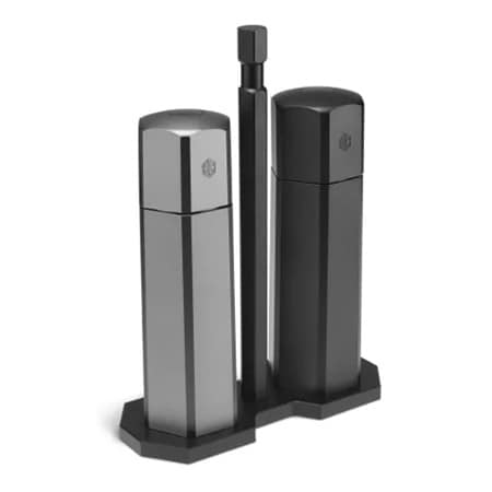 「HexMill ソルト&ペッパーミル セット」は、3点セットでの販売。ソルトミルは高さ11.5cm、幅4.5cm、ペッパーミルは高さ11.5cm、幅4.5cm、キャリーキャディ(専用スタンド)は高さ15.5cm、幅13.5cm。