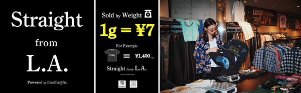 アメリカで直接買い付けた古着が1gあたり7.7円(税込)で販売される。