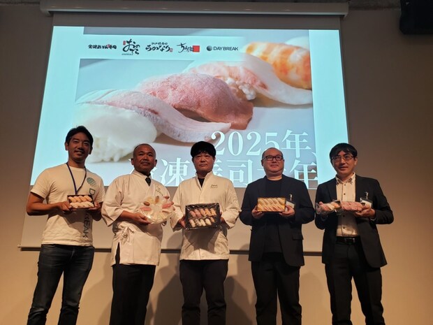 デイブレイクは9月19日、冷凍寿司を体感できる特別販売イベントを東京・有楽町で行った。冷凍寿司はまだ広く認知されている商品ではなく、市場としては小さい。しかし、世界の寿司レストラン市場の規模は2024年に日本円で約1兆4,000億円とも言われており、冷凍寿司も、本格的な日本の寿司を味わえる商品として広がる可能性がある。イベントでは、冷凍寿司を手掛ける5社の商品を通じて、冷凍寿司の魅力を伝える場となった。