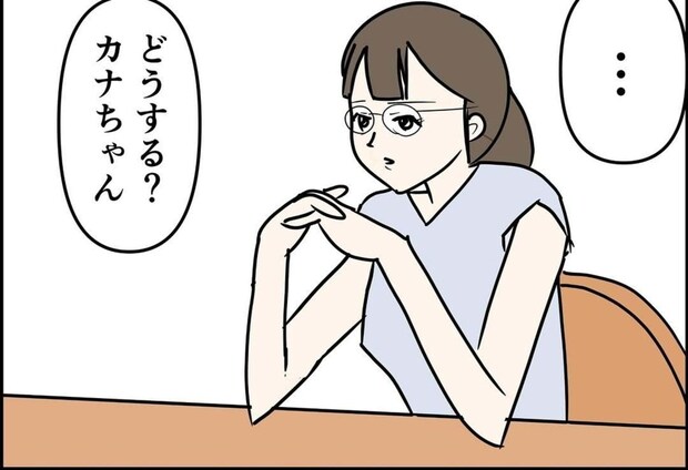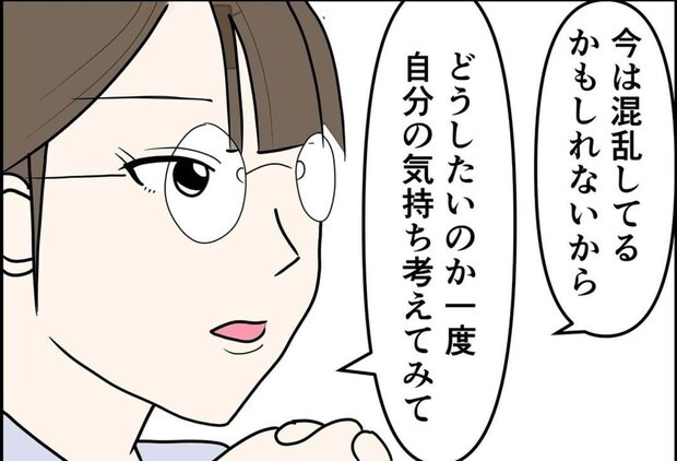 先輩に相談する中で「佳奈ちゃんはどうしたいの?」と問われた佳奈さん。夫の浮気について動揺していた佳奈さんは、「夫に浮気について問いただした後」のことはあまり考えていなかったようです。