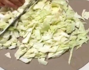 1.キャベツをざくざくと粗めの千切りにします。多少大きさが不揃いでも大丈夫です。最終的に3~5cm幅にすると、生地になじみやすくなります。