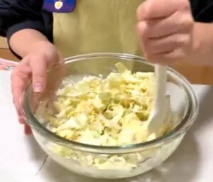 3.切ったキャベツをボウルに加え、生地が全体に絡むように混ぜ合わせます。