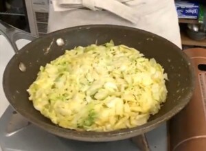 4.フライパンまたはホットプレートを熱し、米油(またはサラダ油)を敷き、キャベツ生地を流し込み、生地を密集させ丸く形を整えます。