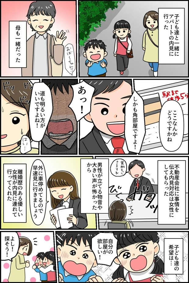 アパートの内覧をし、夫から離れて新しい出発をする主人公と子どもたち。我慢し続けた日々から解放され、子どもにも主人公にも笑顔が戻ったようです。フラッシュバックに悩まされることもありましたが、仕事が心の支えになっていたようですね。