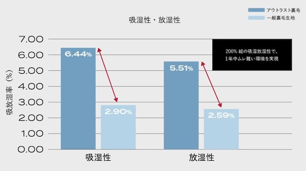 吸水性のあるコットンと吸湿性の高いレーヨンを、速乾性のあるポリエステルと織り込んだオリジナルの軽量スウェット生地を採用。肌面のパイル地がやさしい触感で、滑らかな着心地になっています。もちろんこちらのアイテムも抗菌防臭加工済みで、睡眠中の汗臭や部屋干し臭の心配も軽減。さらに、一般的な裏毛生地の200%超で吸湿放湿性が高い生地なので、寝ているときの嫌なムレを圧倒的に抑えてくれるそうなんです。