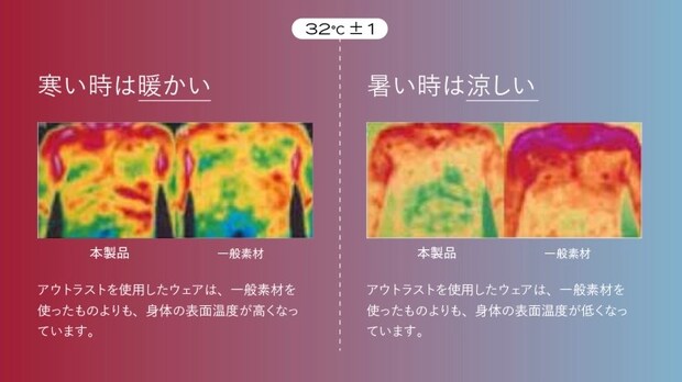 宇宙服のために開発されたアウトラスト(直径20〜30ミクロンのマイクロカプセル)の調温テクノロジーが、温度調整素材として取り入れられています。温度変化に応じて、吸熱、蓄熱、放熱を繰り返し、人が心地よいと感じる32℃±1に肌の表面温度を近づけ保ってくれるなんて驚きますよね。