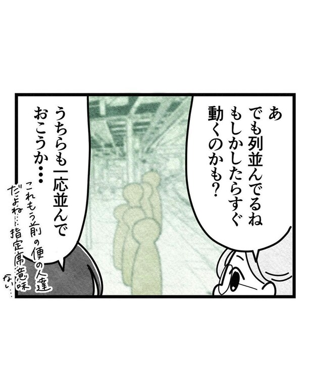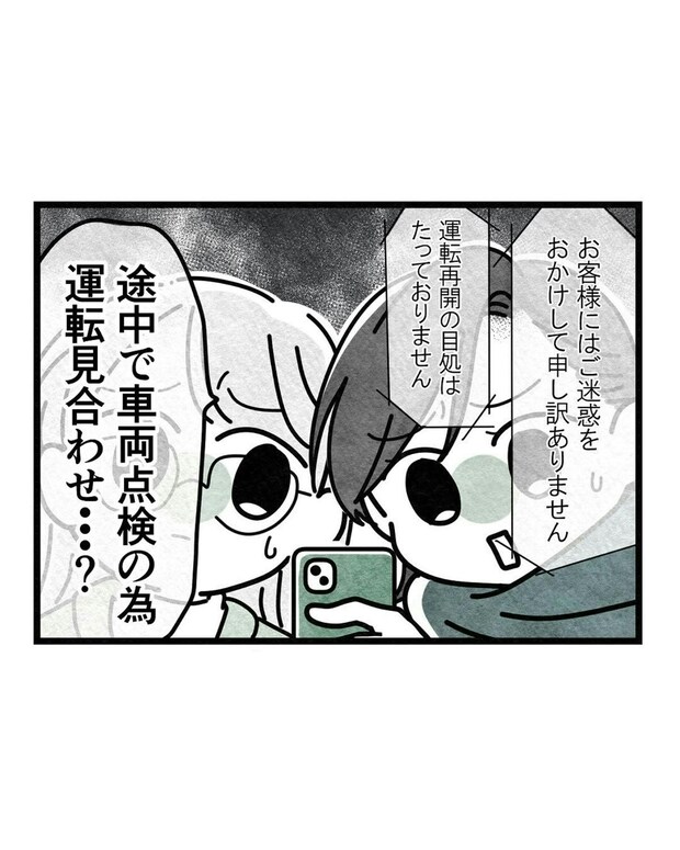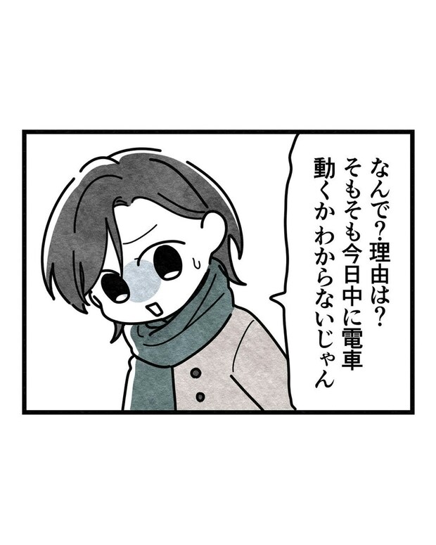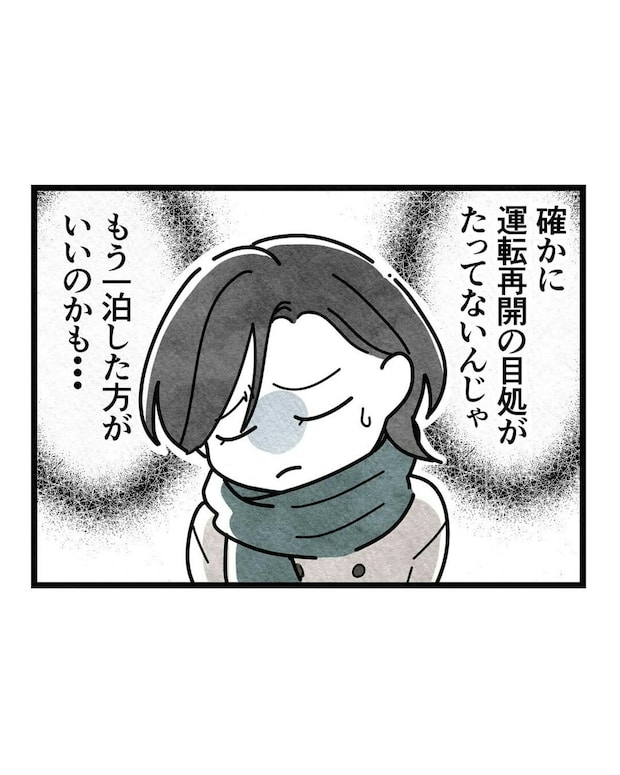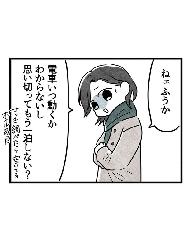生理によって体調が思わしくないさほ。寒風吹きすさぶ中で「運転再開の見込みはない」電車を待つのはつらいですね。一方、「今日中に何とかして地元に帰りたいふうか」はさほの体調不良を知りつつも、いつ再開するか分からない電車の列から離れようとしません。