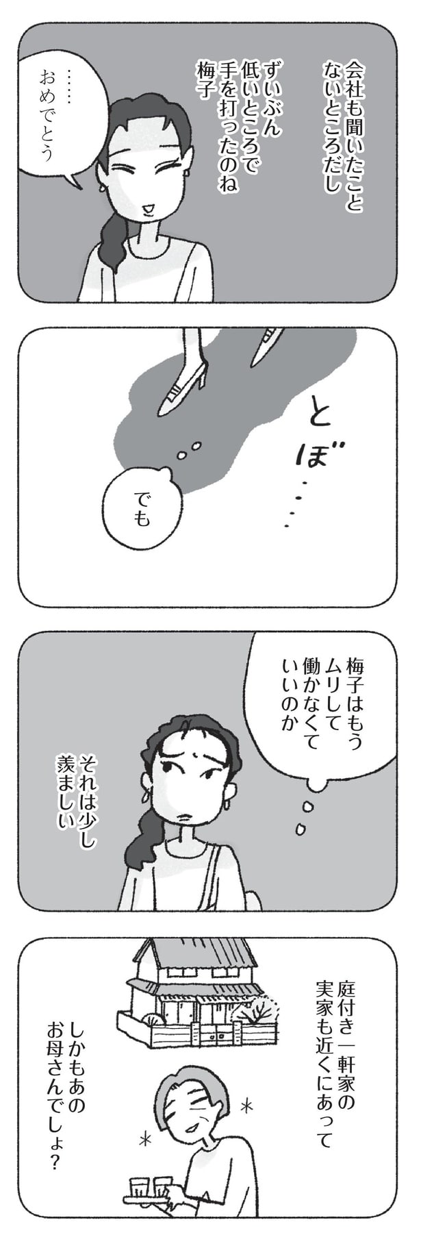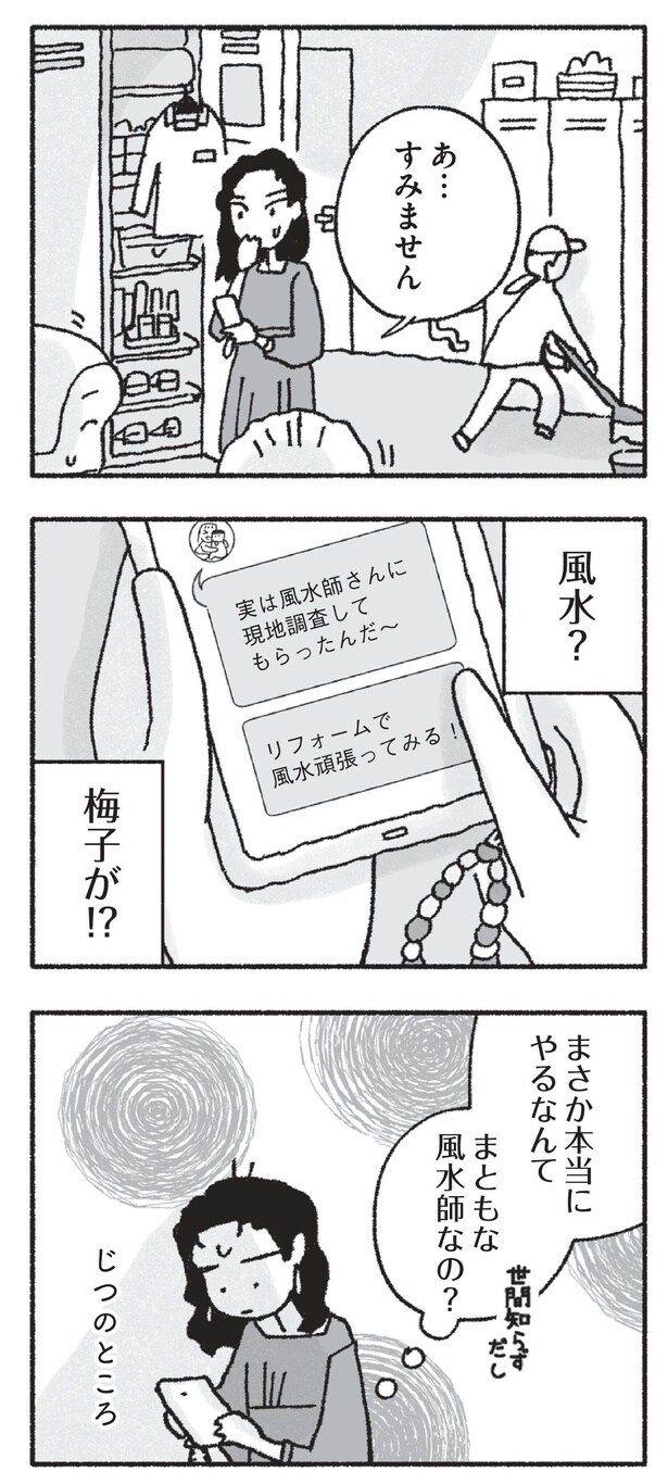 2人の子供と優しい夫に囲まれて幸せに暮らしている専業主婦・梅子。その一方で自分に自信が持てない梅子は、大人になってから「ツイてない」と思うことが増えていた。そんな中、亡き両親が遺した実家のリフォームを計画するが、実家で娘が怪我をするなど不運な出来事が続いたことに不安を覚えた梅子は、親友からの勧めで半信半疑ながらも風水師を頼ることに。風水を意識し始めてから小さな幸運が続き、効果を実感した梅子はどんどん風水に執心していくようになり――?